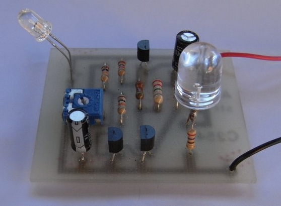 Dieser elektronisch ganz speziell aufgebaute Blinker gibt kurze Flash-Blitzer mit einer ultrahellen Leuchtdiode ab, wenn der Schwellwert bei beginnender Dunkelheit überschritten wird. Dieser Schwellwert kann mit einem Potentiometer stufenlos eingestellt werden. Somit ist es z.B. möglich, mit dieser einfachen Schaltung eine einfache Pseudo-Alarmanlage aufzubauen.